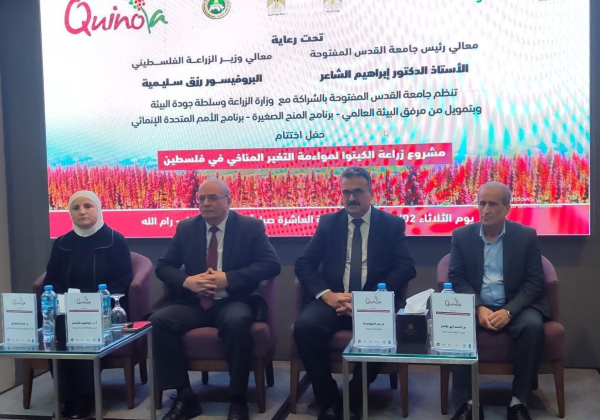 شاركت وزارة الزراعة في حفل اختتام مشروع "زراعة الكينوا من أجل زراعة قادرة على مواءمة التغير المناخي في فلسطين"، الذي قادته جامعة القدس المفتوحة بالشراكة مع سلطة جودة البيئة، وبدعم من مرفق البيئة العالمي–برنامج المنح الصغيرة/UNDP، وذلك خلال فعالية نُظّمت في فندق الكرمل بمدينة رام الله.
