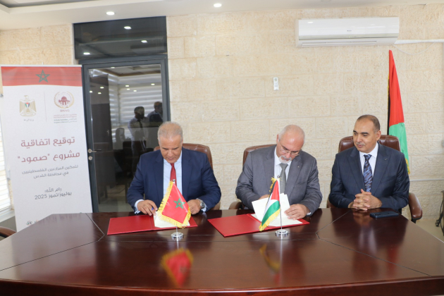 وقّع وزير الزراعة البروفيسور رزق سليمية، اتفاقية تمويل مشروع "صمود" الزراعي مع المدير المكلف بتسيير وكالة بيت مال القدس الشريف، الدكتور محمد سالم الشرقاوي، بحضور سفير المملكة المغربية لدى دولة فلسطين السيد عبد الرحيم مزيان.
